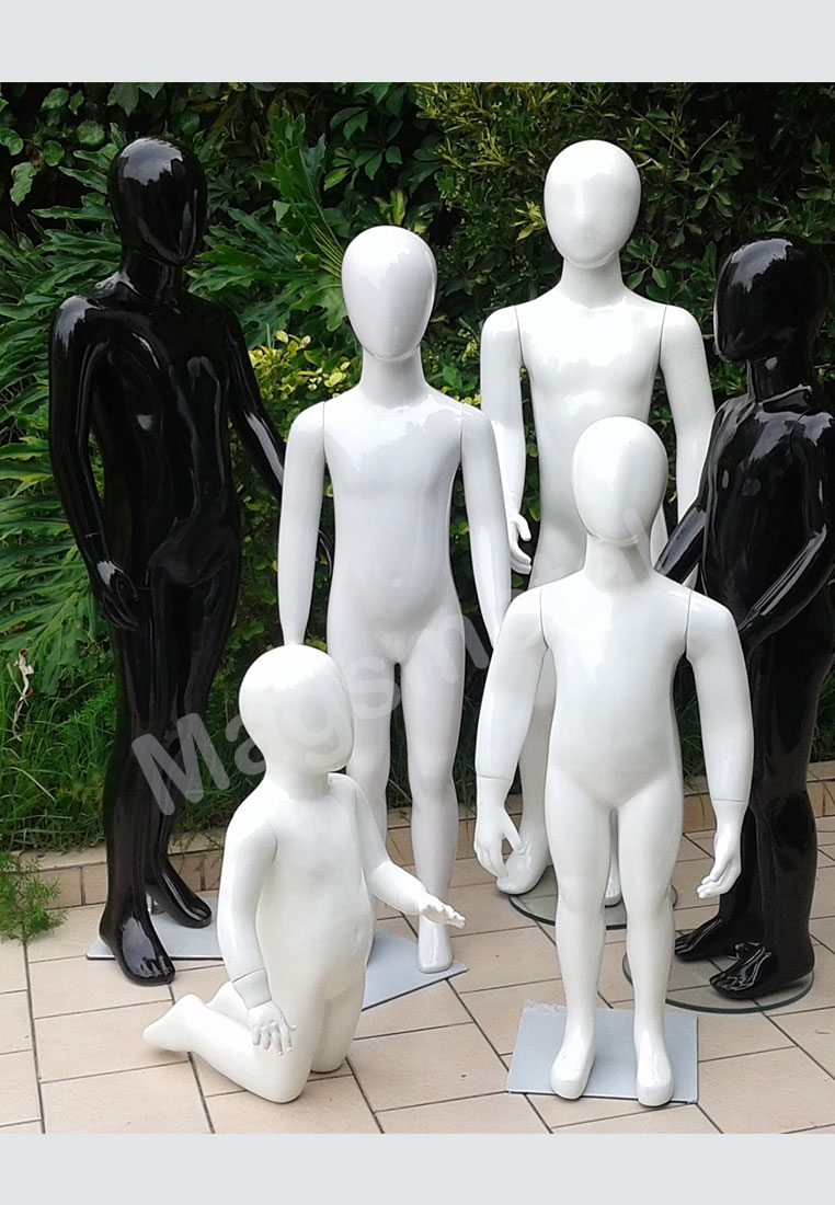 Modelo: Maniqui Linea Infantil. Tamaño: Bebe-Niño-Infantil. Descripcion: Confeccionado en fibra de vidrio y montado sobre pedestal metalico. Color: Blanco-Negro.