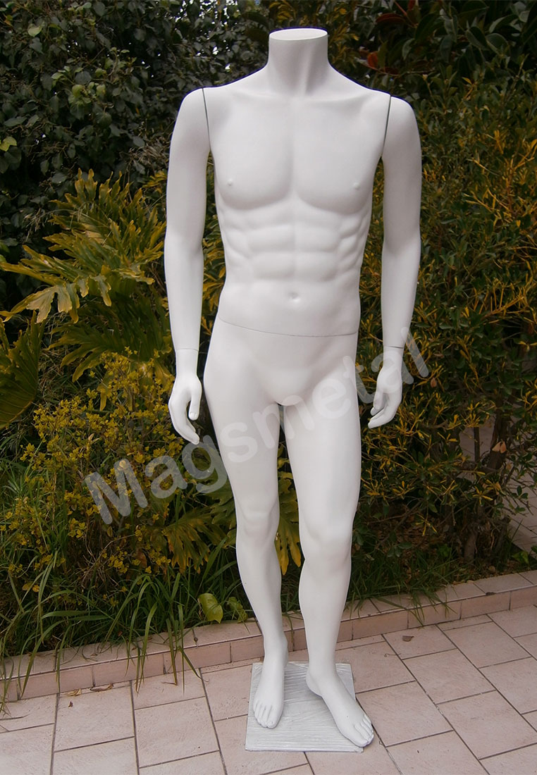 Modelo: Maniqui Cuerpo Completo Sin Cabeza. Tamaño: Adulto Hombre. Descripcion: Confeccionado en fibra de vidrio y montado sobre pedestal metalico. Color: Blanco o/a Elección.