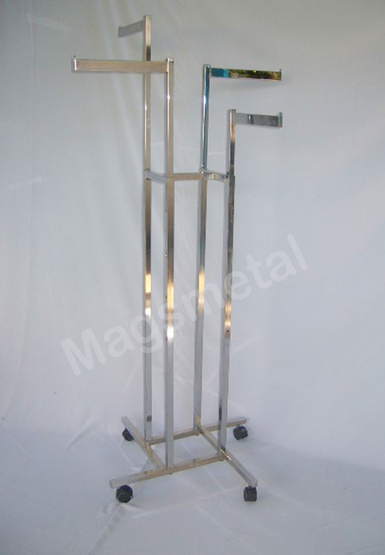 Perchero cromado mod. 4 Puntas Mayor Altura máxima: 1.80 Mts. Ancho: 0.90/0.90 Mts. 4 Brazos regulables en altura Independientes Montado Sobre Ruedas oTopes de Regulación.